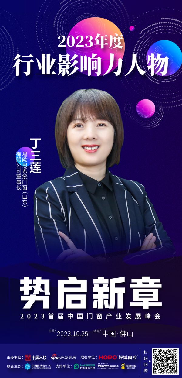 为致敬新时代下引领门窗行业发展浪潮的卓越人物,树立行业标杆,峰会现场重磅公布了“行业影响力人物”榜单。其中,易欧思系统门窗董事长丁三莲荣获「行业影响力人物」称号。