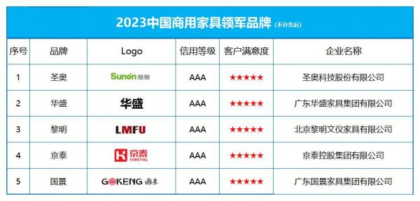 近日,招投标供应链品牌推介平台联合多家权威媒体发布“2023中国商用家具领军品牌”榜单。圣奥、华盛、黎明、京泰、国景等品牌凭借其注重智能化、绿色环保、定制化、多场景化、设计创新等优势从众多知名品牌中脱颖而出,成为中国商用家具行业高质量发展引领者。