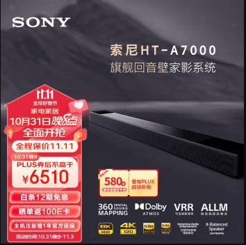 索尼旗舰回音壁HT-A7000相比以往的回音壁拥有更出色的声音素质、更好的环绕声扩散效果以及声音空间表现。A7000是支持索尼独家专利“360智能穹顶声场“技术的最高阶回音壁,还配备了2进1出的HDMI 2.1接口,游戏、影音效果都是一流。7个低失真的全频段空间平衡扬声器,2个特有的波束高频扬声器,音色优美且失真极低,双重低音炮的配置也让A7000能产生强有力的低音音效。同时,A7000连接索尼BRAVIA电视可自动启动“中置声场同步模式”,总之,作为回音壁的旗舰,A7000可以说几乎没有短板,预算足够的话可以直接上A7000+SW5+RS5套装,这个套装可以说是万元回音壁套装天花板,各方面都是顶配,是影音玩家的不二之选。HT-A7000+SW5+RS5套组拥有索尼独家研发的“360智能穹顶声场”,声场优化功能无需精确摆位,只需通过点击遥控器上按键即可让系统自己计算扬声器到房间墙壁和天花板的距离,再将声音优化至贴合使用空间的理想状态,生成多个真实发声的智能扬声器,360度球状发声,制造出超过实体扬声器原有声场范围的更广阔声场。。755组合所搭配的RS5环绕音箱也是索尼目前环绕音响中的最高阶型号,可做到真正的“双无线”工作(无线信号+无电源供电),音质、音效也相当出色,具有很高的硬件素质,是A7000的绝配。而SW5低音炮和A7000之间也采用了非常便利的无线通信,能轻松享受到源源不绝的震撼低音,营造出真正媲美影院质感的氛围。11.11大促期间HT-A7000有大额Plus券,券后价只要6510元,755套装也降至14610元,尽享12期免息,晒单就返100元京东E卡,赠延保365天,还有安心装免费上门安装服务,快来入手旗舰级回音壁,享受绝佳音效体验!