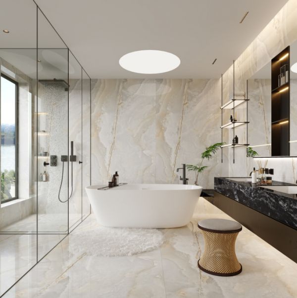 以欧若拉精工奢石为主材的卫浴空间,将奢石高定的韵味彰显的淋漓尽致,没有过多的装饰,只是简单的连纹铺贴,却呈现出最纯粹、极致的美。