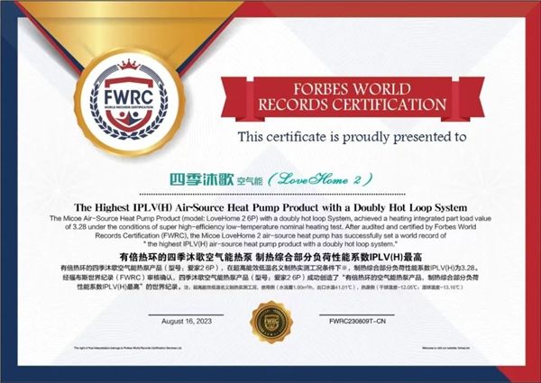 此外,四季沐歌空气能获得了福布斯世界纪录认证,创造了“有倍热环的空气能热泵产品,制热综合部分负荷性能系数IPLV(H)最高”的世界纪录。该认证的成功,标志着四季沐歌空气能在全球清洁能源技术领域竞争力和影响力的跨越提升。