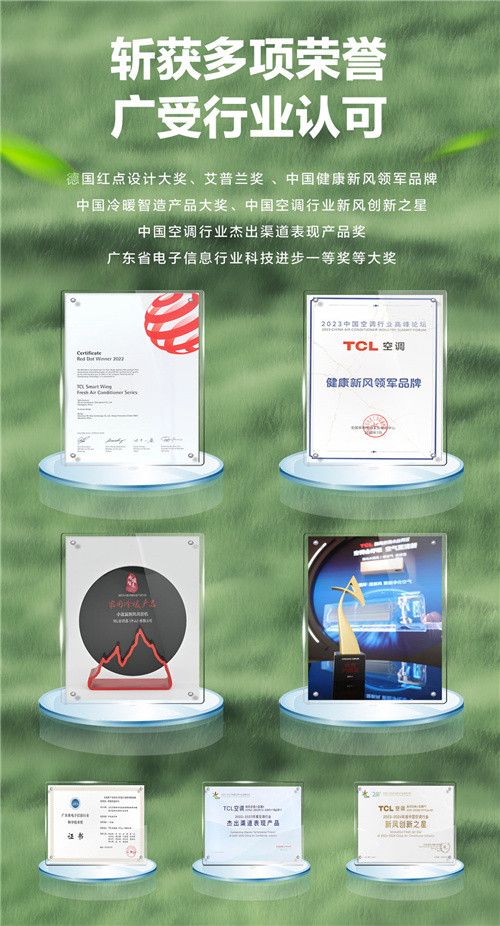 凭借在新风技术上的杰出表现,TCL新风空调斩获包括“德国红点设计大奖”、“中国健康新风领军品牌”、“中国冷暖智造产品大奖”、“中国空调行业新风创新之星”、“中国空调行业杰出渠道表现产品奖”、“广东省电子信息行业科技进步一等奖”等多项国际大奖。奖项背后所蕴含的敏锐洞察与前沿技术,也为TCL新风空调注入源源不断的创新动力。