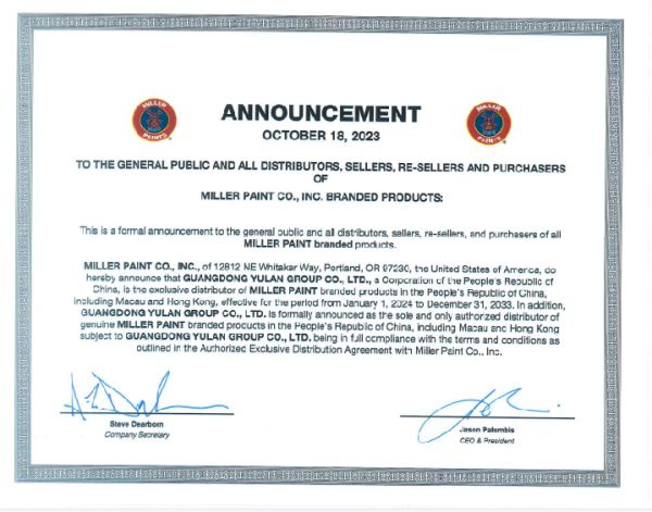 10月7日,广东玉兰集团股份有限公司(以下简称:玉兰家居)与美国MILLERPAINT蜜乐漆(以下简称:MILLER蜜乐),在美国俄勒冈州签署战略合作协议。玉兰家居将全面整合优势营销渠道、近万家终端门店以及完善的售后服务体系,强强联手国际高端涂料美国MILLERPAINT蜜乐,为中国消费者提供高环保、高品质、高性能涂料产品。