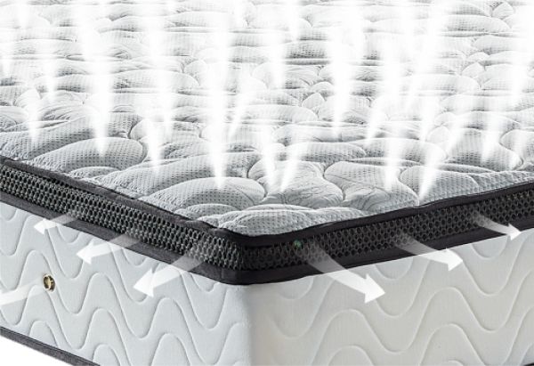 斯丽比迪床垫应用Air Breathing深呼吸透气技术解决睡眠痛点,床垫内外四大循环透气结构的设计,床垫表面清凉舒适,肌肤接触瞬间,带走皮肤大部分热量。通过促进床垫内外空气流通,散热速度更快,有效减少细菌和尘螨的滋生,营造干爽洁净的睡眠环境,从此床垫也能和皮肤同频呼吸,大幅延长深度睡眠时间。