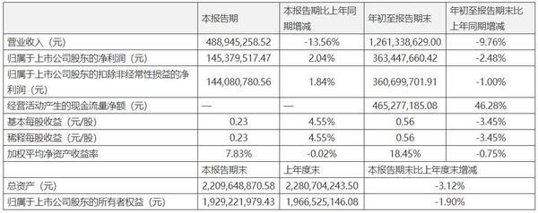 2023年10月29日,浙江美大(002677)近日发布2023年前三季度报,报告期内,浙江美大实现营业收入1,261,338,629.00元,同比减少9.76%;归属于上市公司股东的净利润363,447,660.42元,同比减少2.48%。第三季度归属于上市公司股东的净利润145,379,517.47元,同比增加2.04%。