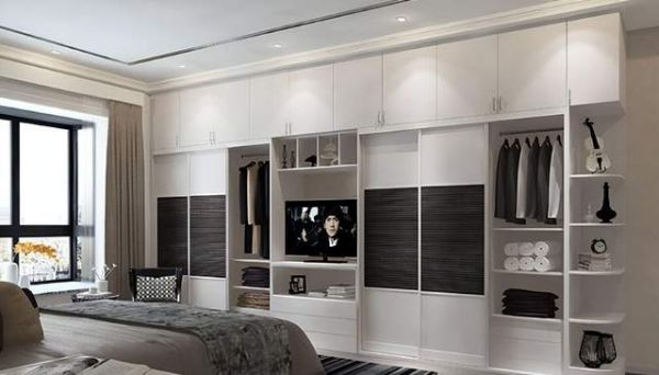 最后这个衣柜内部设计方案非常时尚巧妙,将衣柜与电视背景墙巧妙结合起来,更好地利用了空间,也显得更为时尚精致,将电视机很好的镶嵌在其中,周围的隔板上还能摆放一些装饰品,使得室内显得更加丰富多彩。