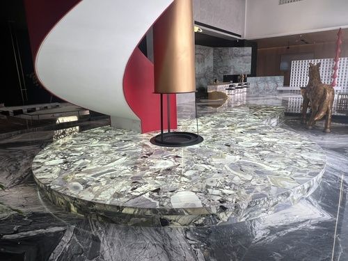 隔行如隔山,就拿福建南安水头镇来说,这里被号称为世界石都,全球最大的石材交易中心之一。来到水头镇,会被大街小巷上琳琅满目的石头闪亮眼睛。这里家家户户做石材、卖石材,品种五花八门,名字花样多样,外行人完全看不懂这些石头的故事。作为近年来最火的奢石品种之一“冷翡翠“,深受设计师的喜爱,它能为建筑与室内空间带来很强的生命力和艺术感。有次带设计师到石材市场逛了一圈,发现这款材料却有很多”门道“。