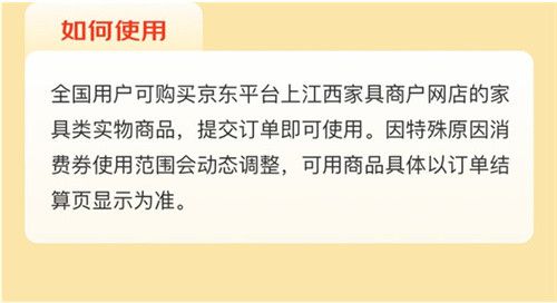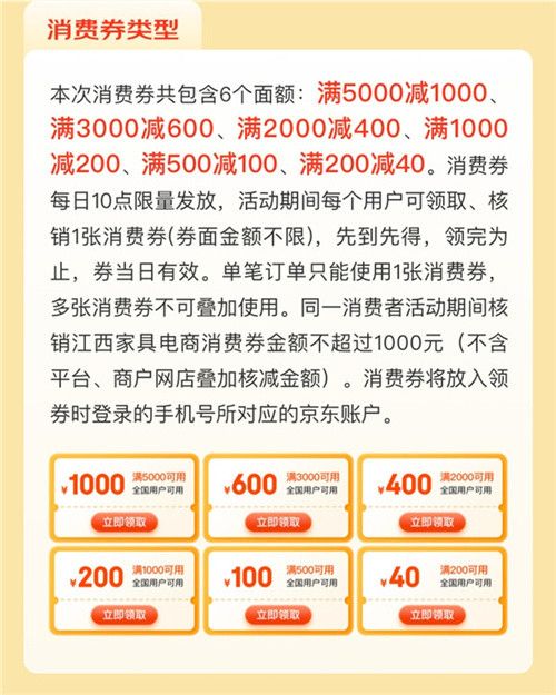 本次消费券共包含6个面额: 满5000减1000、满3000减600、满2000减400、满1000减200、满500减100、满200减40。消费券每日10点限量发放,活动期间每个用户可领取、核销1张消费券(券面金额不限),先到先得,领完为止,券当日有效。单笔订单只能使用1张消费券,多张消费券不可叠加使用。同一消费者活动期间核销江西家具电商消费券金额不超过1000元(不含平台、商户网店叠加核减金额)。消费券将放入领券时登录的手机号所对应的京东账户。