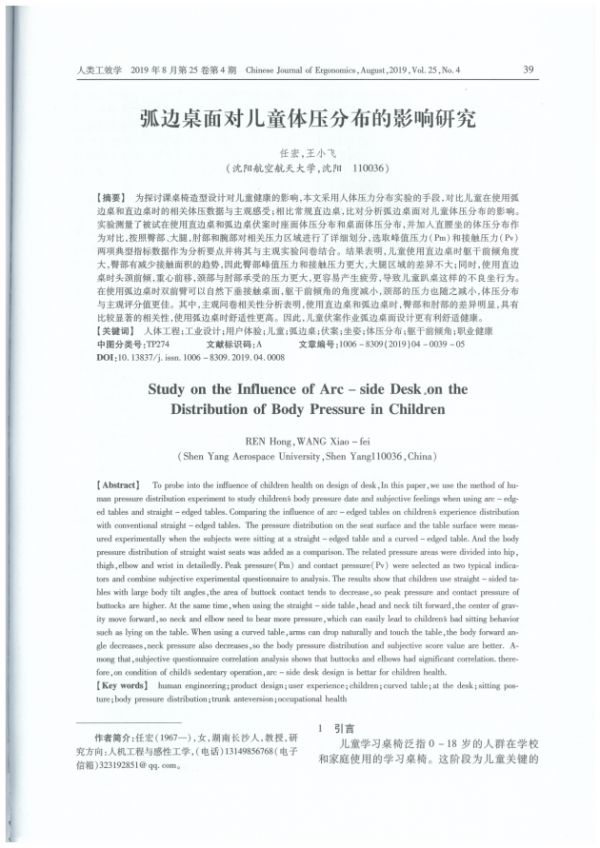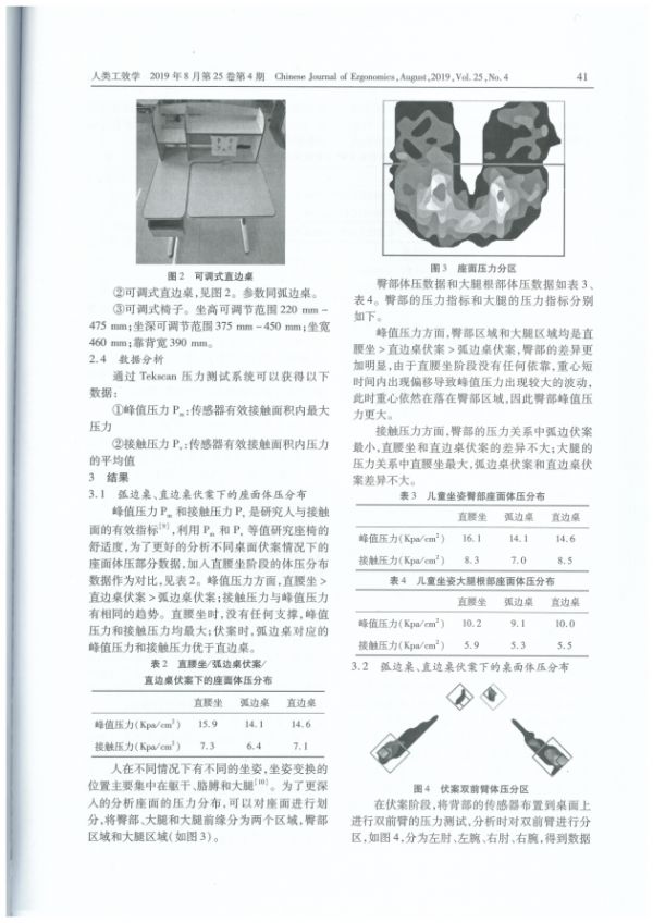 实验显示,在伏案学习状态下,座面体压(即臀部压力)的峰值压力和接触压力,弧边桌均优于直边桌;在书写时,左右腕、肘部的接触压力和峰值压力,弧边桌明显比直边桌更具优势。而在主观问卷数据分析中,弧边桌的下肘部和胸部的舒适性得分也好于直边桌。