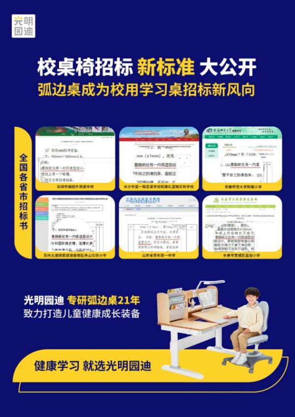 但你知道吗?近几年多省市学校已经制定了招标新标准,明确将“靠胸前处有一内弧造型设计”放到了校桌椅采购的招标文件上。弧边桌正在被学校认可并采纳,从家庭到学校,已经成为孩子健康学习好伙伴。