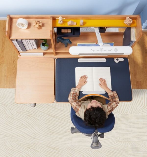 光明园迪21年潜心研发弧边学习桌,专为儿童健康成长发育设计,让孩子学习时身体前进7厘米,手肘自然放在桌面上,肘部有支撑,缓解肩颈压力。弧边学习桌搭配正姿椅,背部舒适承托,身体自然挺直,两个手肘与背部形成了稳定的黄金三角,帮助孩子轻松保持标准“三一”坐姿,并且久坐不累。