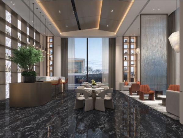 以“光”作为陪伴载体,讲述精奢质感,融合生活与艺术,给予消费者时间与空间上的陪伴。大堂接待区选用黑色的精工奢石大面积,设定精奢艺术基调,再藉由家具家饰的物件细节雕刻态度与品味,将艺术氛围和感性于不经意间传达至空间的每一处,也让空间有着不同的韵律过渡。