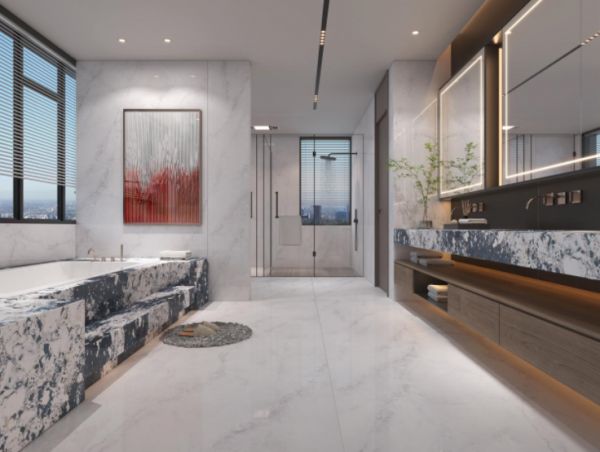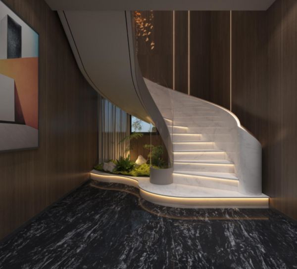 水吧区域采用了透光设计,精工奢石自带科技与神秘的气息,抵挡不住的前卫感和高级感。奢石旋转楼梯,冷酷又尊贵的气场瞬间全开,让空间更简洁,更利落,富有艺术感。卫浴空间采用极简的设计和极简的用材,奢石台面和奢石浴缸营造出简洁、有温度的美学特征。