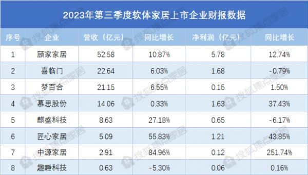 软体家居上市企业2023年第三季度财报已陆续发布,整体盈利表现较为稳定。根据搜狐焦点家居截至目前已统计的八大上市企业财报,有6家实现净利上涨,过半企业营收、净利双增。