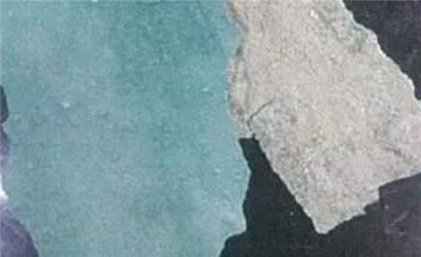 现场防水层背面粘有基层砂浆材料,可见基层强度差,使得防水膜层与基层的粘结力降低或出现分离脱落情况。
