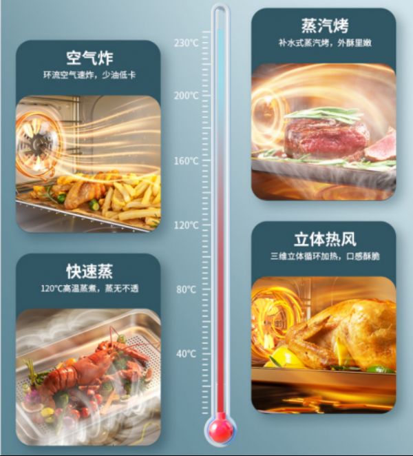 烹饪功能上,ET50 Pro蒸烤一体,有着全新升级的集八大模式于一体的厨房超能力,高效又高能。60L 大容量,上炖炒、下蒸烤,同时开工,30 分钟一桌菜;双管平嵌式蒸汽加热盘,蒸汽大,升温快,蹄髈大骨轻松蒸透,加上三面六管环流热场+150mm 大叶风扇,快速升温,控温更均匀;健康空气炸,脱脂低卡更健康,享受美味无负担;补水式蒸汽嫩烤,肉质鲜嫩多汁不干柴,烤制更出色、上色更美味、口感更上乘。
