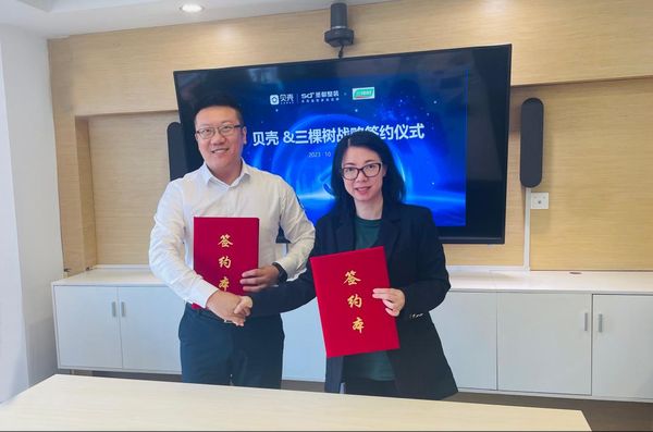 10月23日三棵树与贝壳整装家居达成全面战略合作,共同开启高端涂装,健康家装的“美好生活”全新时代。贝壳战略投资与供应链寻源采购中心建材部供应链总监周建丽和三棵树装修漆事业部总经理王通虎代表双方企业签署战略协议。