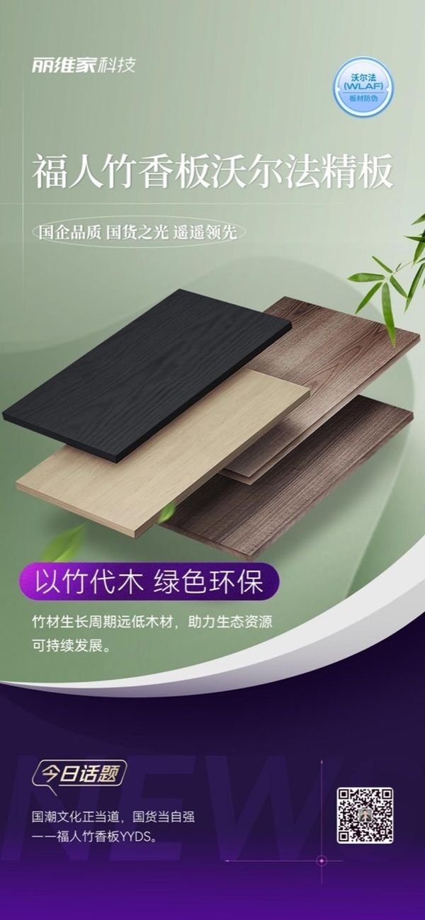 所以,不管是从可持续发展还是原材料特性出发,竹板材都极具推广价值。而在“以竹代木”这个新兴赛道上,福人竹香板沃尔法精板已率先向市场掀起了这波基于竹子基材的“绿色革命”,并逐渐成为板材市场中一股新的环保时尚。
