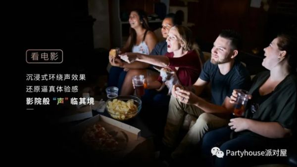Partyhouse派对屋对声音的坚持和对技术的要求,使音响系统能够提供全景声沉浸式空间音效,立体声音定位体验。杜比全景声(Dolby Atmos)使用户产生身临其境的感受,将真实感提到了一定的水平,实现声音的精确定位,在观影过程中,用户能获得声场从四面八方带来鲜活和稳定的表现,甚至在头顶,都能听到声音精准任意地移动,例如直升机在头顶上盘旋、忽近忽远的声音,将观影者置身场景之中。