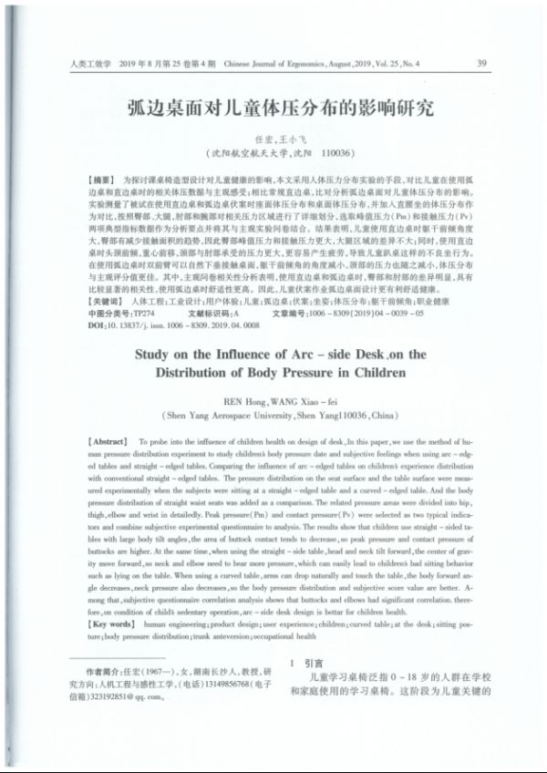 沈阳航空航天大学任宏、王小飞教授在《人类工效学》杂志发布的《弧边桌面对儿童体压分布的影响研究》从多方面实验研究及儿童试坐体验得出“儿童伏案作业弧边桌面设计更有利舒适健康”。