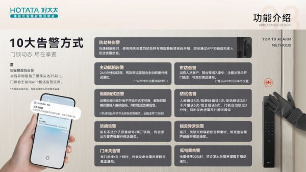 除了解锁方式高度智能化,它还设计有十大告警方式,基本囊括了日常用锁有可能遇到的痛点问题。比如平日里因为粗心或者有急事出门,匆忙中没有关好房门,这时好太太智能锁就会发出告警信号,提醒用户关好房门,化解未知风险。还有这款好太太智能锁搭载了厘米波雷达感应器,如果有人在门前徘徊,异常逗留,就会触发侦测抓拍功能,并把图像信息实时推送到手机。随时随地都能了解家门外的状况。