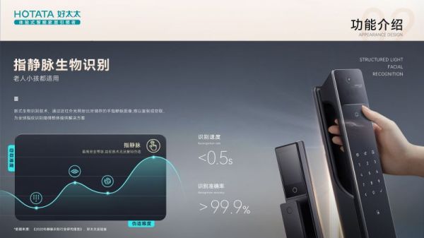 它拥有多种解锁方式,其中最为便捷的是人脸识别和指静脉识别方式,无论是粗心忘带钥匙,还是手提重物不方便翻找钥匙开门的情况,都可以通过这两种方式识别开锁,而且安全性也很高。其中人脸识别系统是采用活体深景检测,红外光投射器经DOE衍射到人脸上,采集计算得出每个投射点的三维深度信息,可以防止照片和视频冒充解锁。而指静脉识别,是一项新的生物识别技术,因为指静脉信息唯一且无法仿制,且识别过程必须是有血液流动的活体才能识别,安全性也升级到新高度,识别速度更快,不到半秒时间就能识别开门了。