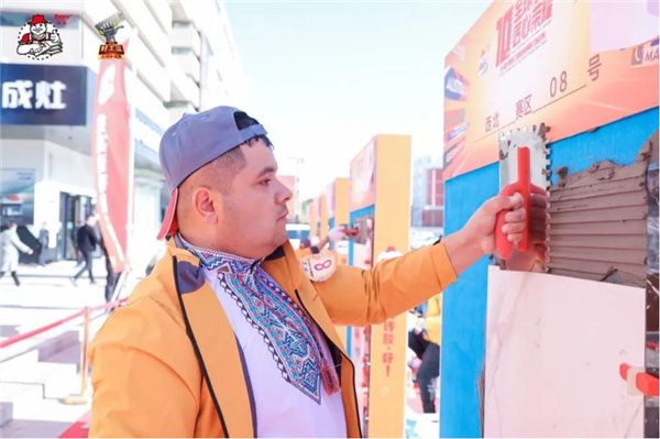 比赛现场气氛紧张而激烈。瞧,这位少数民族选手大显身手,贴起砖来手法相当娴熟,齿形刮板耍起来,游刃有余,自然流畅!