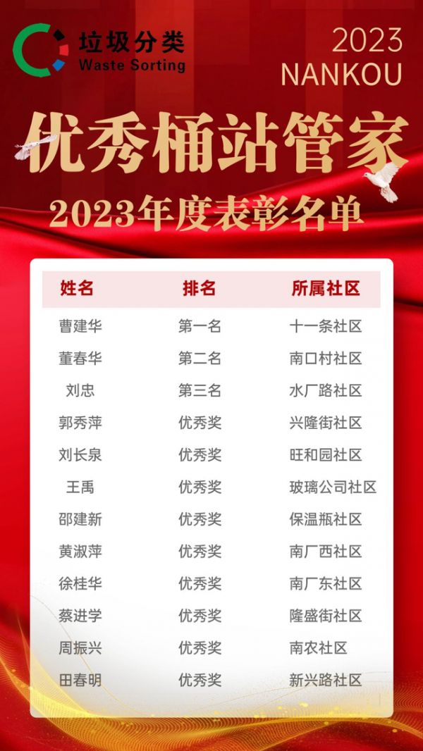本次评选由各社区负责人从自有星级桶站中选择提交候选人,由垃圾分类专班汇总后,交由评选小组进行终选。最终在27名候选人中,评选出前3名,及9名优秀奖,并举办颁奖典礼为受表彰者颁发“优秀桶站管家”证书及奖品。