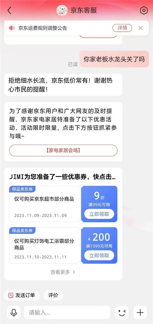 轻松省下数百元的网友在弹幕热情表示:“老板家里还有什么要换的吗?带带我们!”原来,此次京东采销直播间帮网友换水龙头的名场面,缘起于“网友提醒刘强东老家水龙头忘关了”热搜话题。11月7日晚该直播间喊话东哥更换九牧智能感应龙头,也让众多网友种草了同款。除了连续两天晚上的老板同款5折不限量福利,京东为了回馈热心网友的关注,还特别推出了专属优惠券,网友点开京东客服对话框,输入“老板+水龙头”关键词,即可触发多品类优惠券,领券购物更实惠。这波操作让网友直呼“京东太有诚意了”“有求必应,京东能处”!