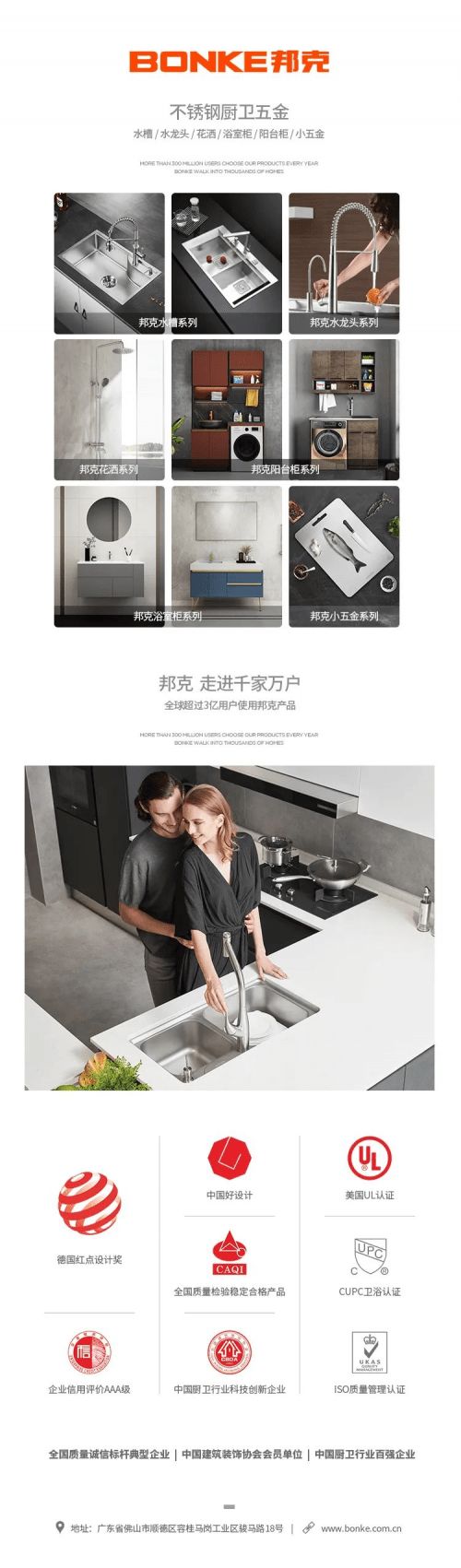 从厨卫五金单品延伸至涵盖不锈钢水槽、水龙头、淋浴花洒、壁龛、垃圾处理器、阳台柜、浴室柜、五金挂件、配件等一系列标准化智能厨卫五金产品。无论是新房装修还是老房改造,消费者都可以通过邦克,一站式购买到符合自身需求的高品质五金产品,从而实现家居的功能性、美观性和品质感的全面提升。