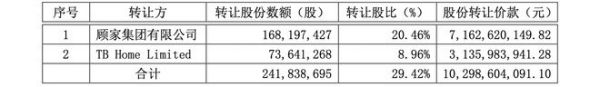 根据顾家家居的公告,顾家集团将转让占公司总股本的20.46%股份,转让金额为71.63亿元;TB Home转让的股权占公司总股本8.96%,转让金额为31.36亿元。