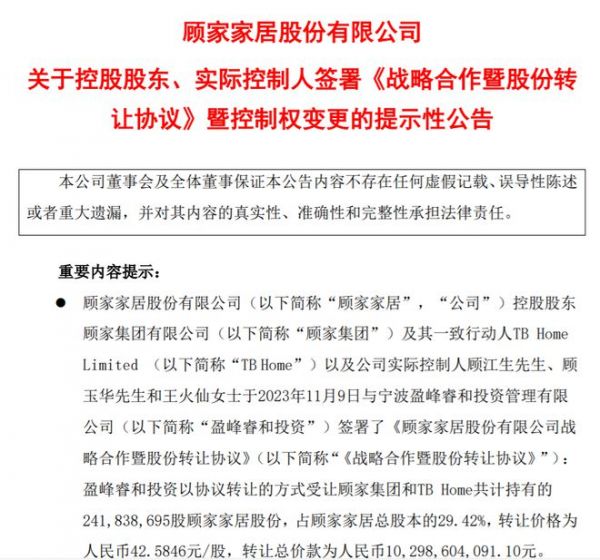 盈峰睿和投资以协议转让的方式受让顾家集团和TB Home共计持有的241,838,695股顾家家居股份,占顾家家居总股本的29.42%,转让价格为42.58元/股,转让价款为102.98亿元。本次交易完成后,顾家家居控股股东将由顾家集团变更为盈峰睿和,顾家家居的实际控制人也将由顾江生、顾玉华、王火仙变更为何剑锋。