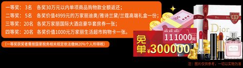 活动期间内(2023年11月1日-12月12日),在万家丽家居建材广场&万家居生活广场任意门店实付满10000元,凭加盖售后服务章的购物凭证与现金抵用卡即可参与超级返现抽奖1次,跨品牌可加赠1 次,最高3次封顶。返现百分百中奖,最高可中4999元!