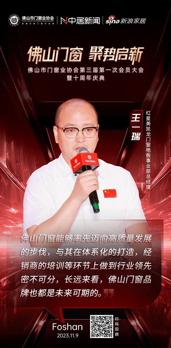 11月9日,“佛山门窗·聚势启新——佛山市门窗业协会第三届第一次会员大会暨十周年庆典”在佛山举办。在论坛环节中,红星美凯龙门窗地板事业部总经理王一瑞表示,佛山门窗能够率先迈向高质量发展的步伐,与其在体系化的打造,经销商的培训等环节上做到行业领先密不可分,长远来看,佛山门窗品牌也都是未来可期的。