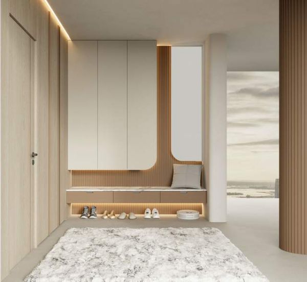 精简素雅的视觉体系,营造尊崇归家仪式感,多重收纳功能,让生活井然有序,尽显从容。不规则设计的镜子,安装在门的正对面,提供了视觉上的空间延伸感,也方便整理形象。