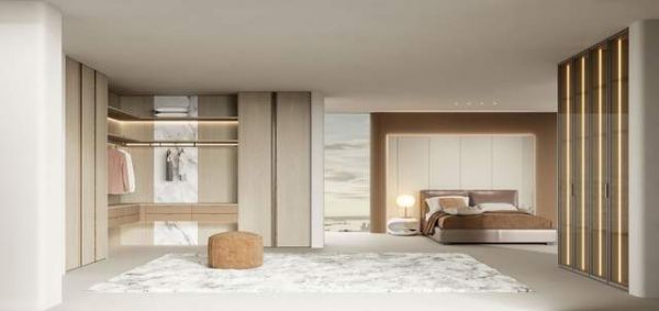卧室与衣帽间一体设计,开启无界美学新境,L型衣帽间,虚实结合,勾勒出低调的奢华。