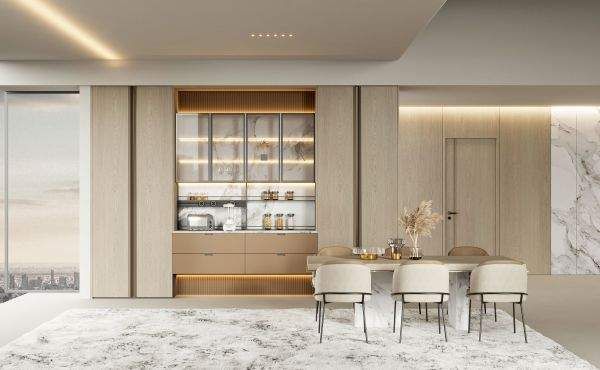 餐厨一体,促进一家人的交流、陪伴与互动,半开放式餐边柜,呈现自然净透的空间质感。