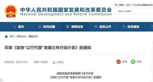 11月6日,国家发改委发布消息,根据2日由国家发展改革委工信部、财政部、国家林草局四部门印发的《加快“以竹代塑”发展三年行动计划》(以下简称《行动计划》)做出解读。