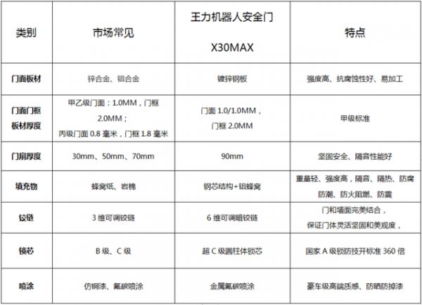 门面板材,是门体坚固度、美观度的基础。市面上常见的安全门材质是冷轧钢或者锌合金。板材厚度标准一般是甲乙级门厚1.0毫米,门框2.0毫米;丙级门厚0.8毫米,门框1.8毫米。王力机器人智能安全门X30MAX选用的镀锌板,是表面涂了金属锌的防锈钢板,具有强度高、抗腐蚀性好等特点,使用寿命更长。门面板材1.0/1.0MM,门框板材2.0MM,都符合行业甲级标准。