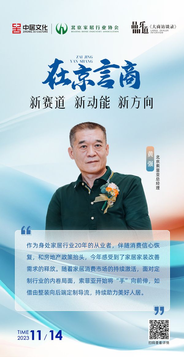 北京索菲亚总经理 黄强:作为身处家居行业20年的从业者,伴随消费信心恢复,和房地产政策抬头,今年感受到了家居家装改善需求的释放。随着家居消费市场的持续激活,面对定制行业的内卷局面,索菲亚开始将“手”向前伸,如借由整装向后端定制导流,持续助力美好人居。