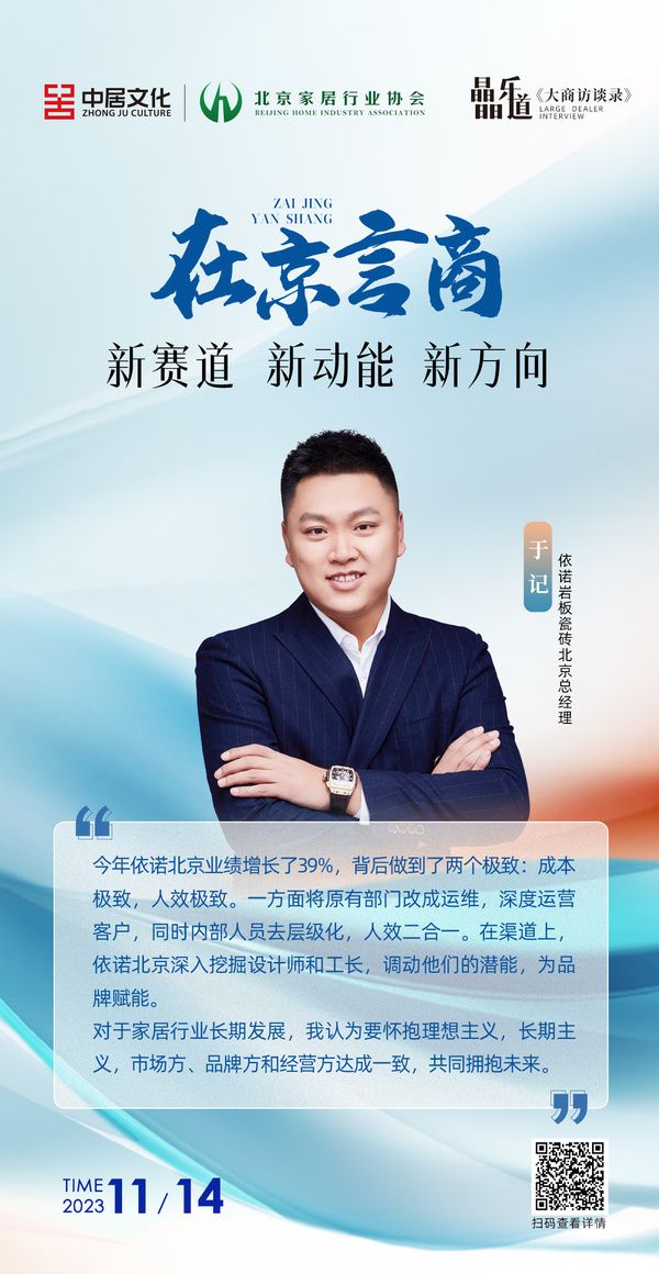 依诺岩板瓷砖北京总经理 于记:今年依诺北京业绩增长了39%,背后做到了两个极致:成本极致,人效极致。一方面将原有部门改成运维,深度运营客户,同时内部人员去层级化,人效二合一。在渠道上,依诺北京深入挖掘设计师和工长,调动他们的潜能,为品牌赋能。