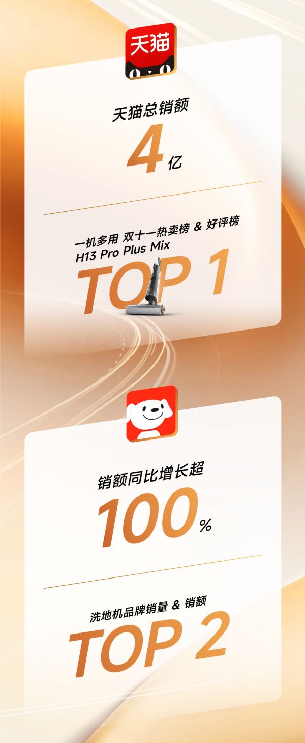 战报显示,在天猫和京东两大综合电商平台上,追觅洗地机表现强势。其中,追觅洗地机在天猫总销售额破4亿,且H13 Pro Plus Mix斩获天猫“一机多用 双十一热卖榜 & 好评榜”双TOP 1.追觅洗地机在京东GMV更是增长100%。
