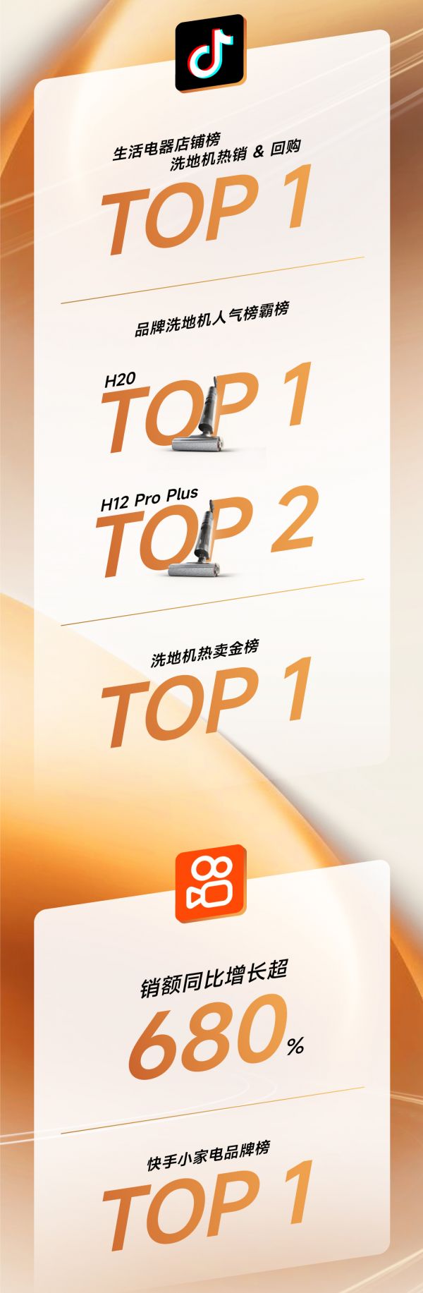 值得一提的是,作为抖音、快手等新兴电商领域的后起之秀,追觅洗地机更是在极短的时间内实现了赛道的弯道超车。根据战报,追觅H20和H12 Pro Plus分别霸榜“抖音品牌洗地机人气榜” 前两名。此外,追觅洗地机在快手平台更是实现了惊人的680%增长。