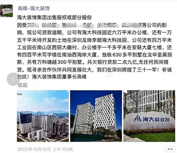 无独有偶,上个底深圳知名装企海大装饰集团的董事长高峰一张“深圳海大装饰集团董事长发朋友圈出售股份救急”的图片广为传播。截图内容中称,因受房企影响,现公司贷款逾期,共欠银行贷款2.9亿,出售股权或部分股权。