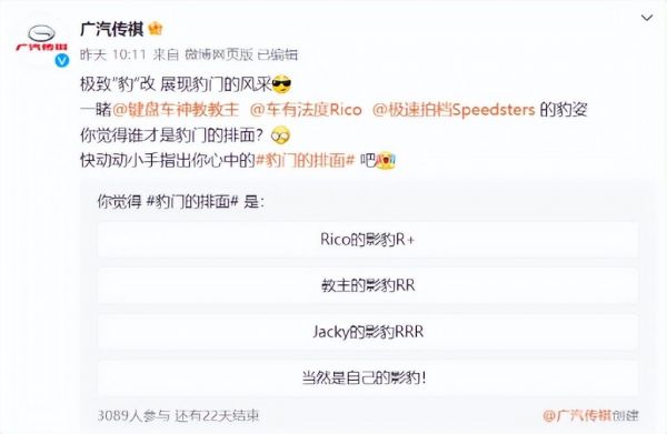中国人+中国车+中国改装件在纽北刷新圈速这件事,还引发了一连串的“连锁反应”,各大玩车达人按捺不住,纷纷对自己的影豹“下手”了。极速拍档主持人——王杰克将改装全球第一台手动挡影豹,命名为“影豹RRR”,车有法度主理人Rico也改装升级了一台“影豹R+”,加上教主的“影豹RR”,“豹门”这下可谓热闹非凡,期待三台“豹”改后的影豹R在一起PK的呼声越来越高,广汽传祺官微近期还发起了谁才是“豹门的排面”投票,看来,三大魔王的PK也要一触即发。