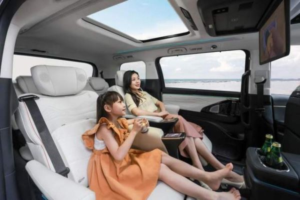 具体来看,E9采用同级独有、顶端的半苯胺高级真皮面料,打造豪华头等舱座椅,尽显极致奢雅之余,还有二排“一键SPA”按摩、一排头枕4向调节等功能,细心守护每一位乘客的舒享旅途,以及可收纳小桌板、升级二排侧窗遮阳帘等,细致满足用户需求。