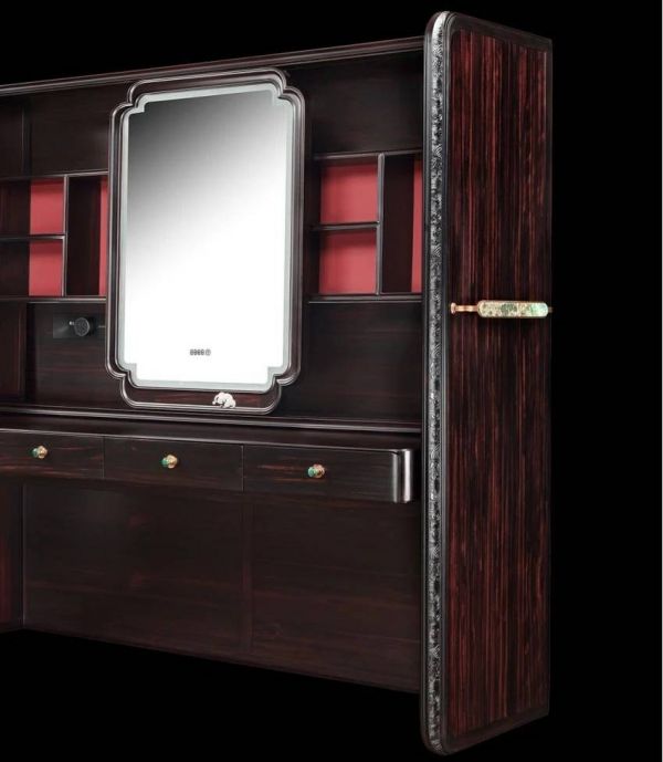 简悦空间东方取意,疏简赋形。巧妙打造独立式妆台,两侧雕刻生动形象,将现代艺术的张力和层次感有效贯穿。侧边以景泰蓝把手装饰,花边造型化妆镜可左右移动,配置智能感应功能,打造精致妆容,更能实现对妆造空间的有序收纳。