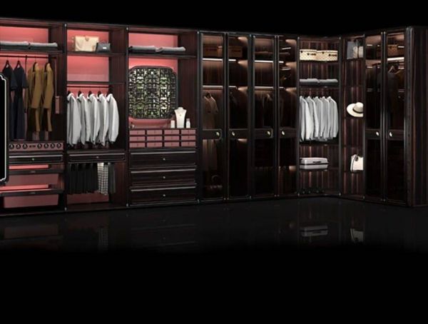 衣帽间,呈开放式储物空间,与央玺东方神韵完美契合,赋予空间无拘的自述力。应用烤漆玻璃门,内置智能化一体集成工艺,内嵌LED 照明系统,充分满足生活仪式感。