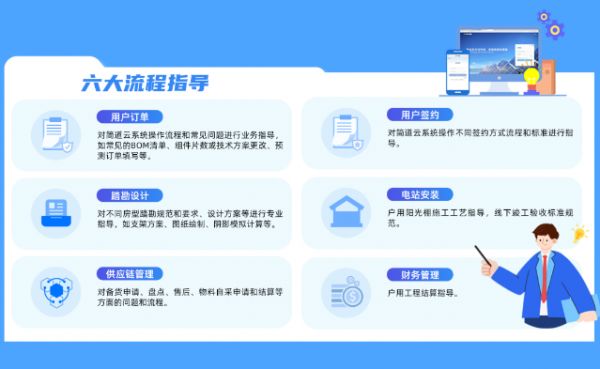 升阳光·E学汇线上学习平台课程设置系统而全面,不但开设了商务审核、技术审核、并网审核以及技术质量审核四大核心课程,还同时开设了用户签约、用户订单、踏勘设计、供应链管理、电站安装及财务管理六大流程指导,从客户签约到最终的并网的所有环节均涵盖在内,能有效地帮助众多合作商快速了解升阳光家庭光伏品牌及业务开发流程。