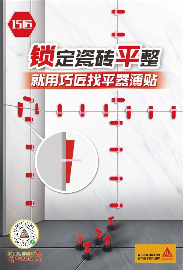 在做找平施工的时候,使用巧匠找平器能确保找平卡位时,薄贴效果更好,砖更平整。且不易断裂、施工结束后易清理,在找平器的助力下,缝宽均匀,也为后续美缝打好基础。
